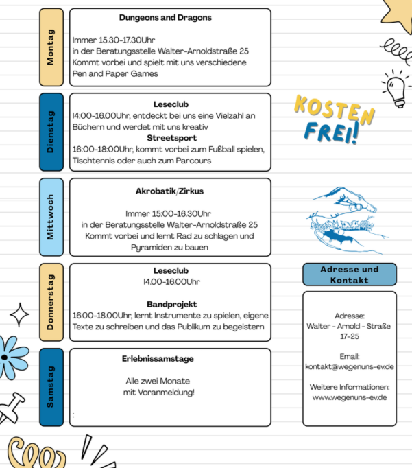 Spielmaterialen, Instrumente und ähnliches haben wir vor Ort. Ihr braucht nur eure Fantasie!